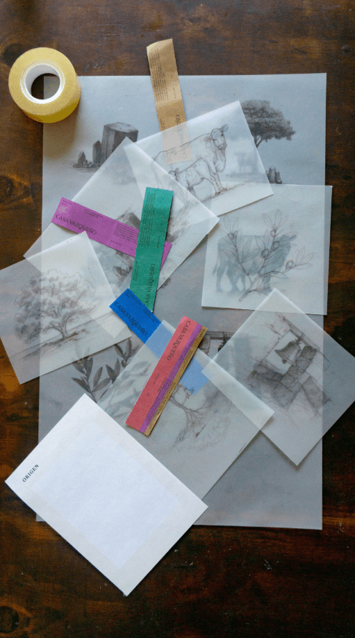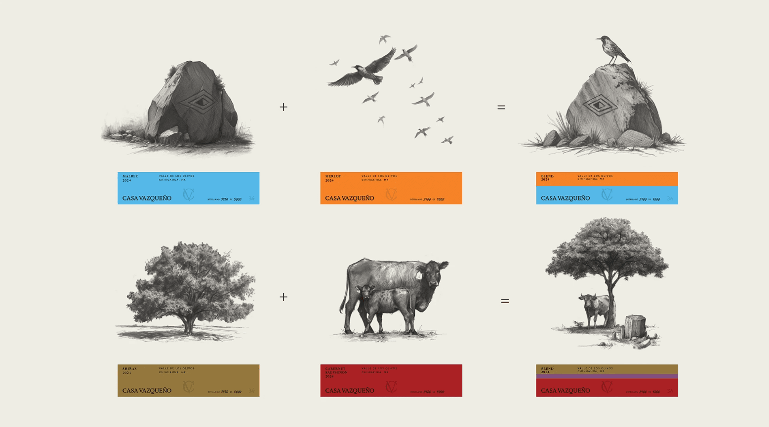 We started by deeply studying the estate, its land, its history, its living elements to identify what makes this place truly singular. From that research, we developed a specific illustration for each defining element: the walnut trees, the endemic birds, the estate's church, and the strange square stones unique to this region that, through the eyes of the Rarámuri, the indigenous people of Chihuahua, are not passive matter but silent spectators holding centuries of memory. Nothing was invented. Everything was found on site.